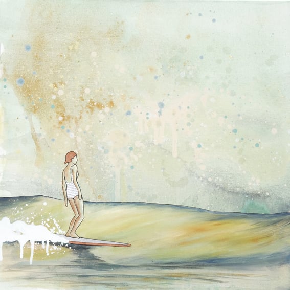 The “Lady Slider” series is inspired by the natural grace of women surfers and the beauty and fragility of the ocean. Messages of the oceans vulnerability and sustainable living are relayed throughout the painting via articles that are cut out from old surf magazines. The original paintings are created from a combination of acrylic paint, spray-paint, old surf magazines, paint pens, ink and resin.