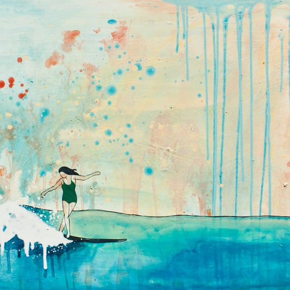 The “Lady Slider” series is inspired by the natural grace of women surfers and the beauty and fragility of the ocean. Messages of the oceans vulnerability and sustainable living are relayed throughout the painting via articles that are cut out from old surf magazines. The original paintings are created from a combination of acrylic paint, spray-paint, old surf magazines, paint pens, ink and resin.